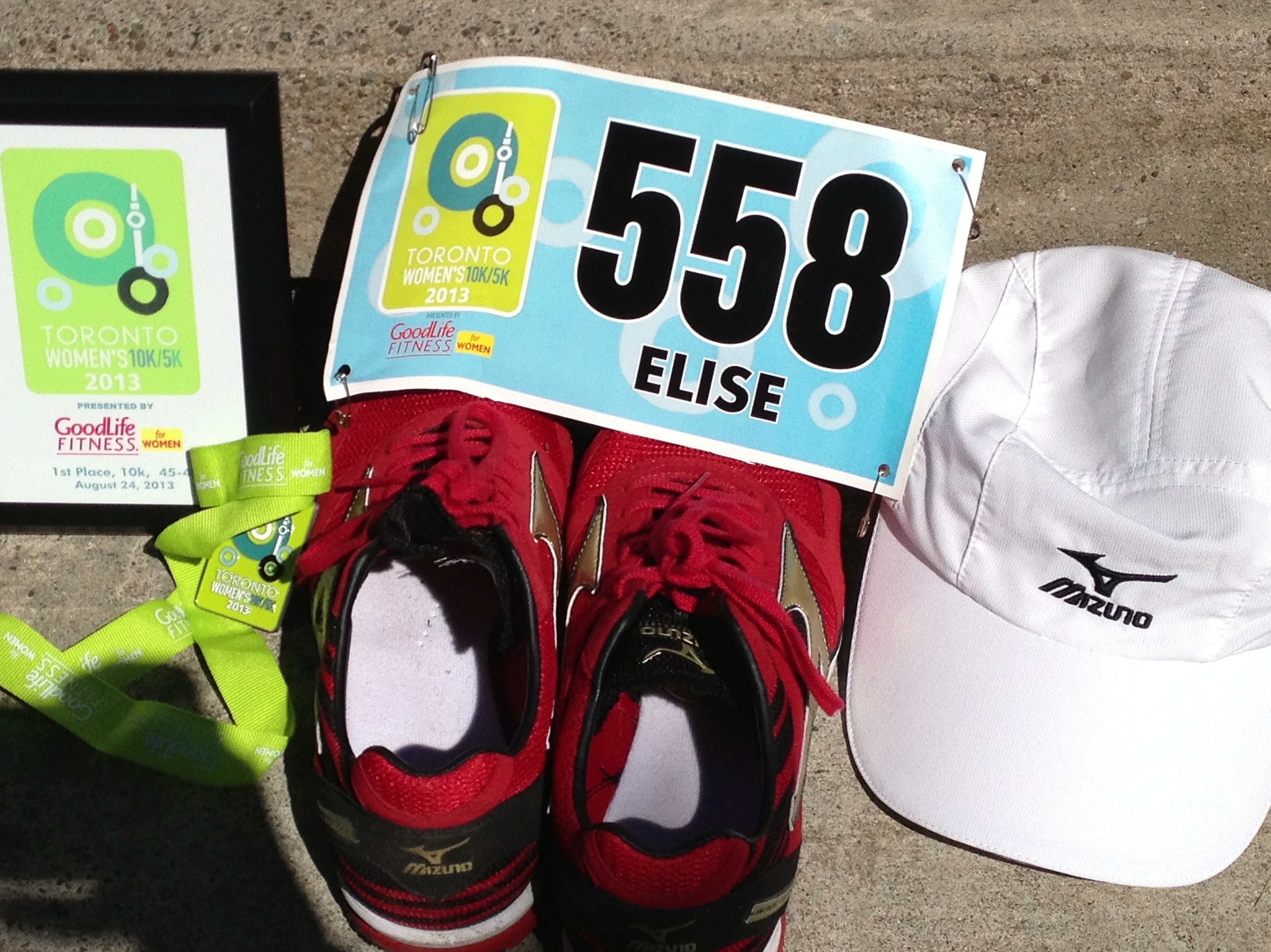 I came home with some hardware (Mizuno hat and a plaque). I ran in my Mizuno Wave Ekiden which I just LOVE for 10km races and longer speed workouts. They are so light and comfortable but still give me that little bit of something underfoot. I feel like I have nothing on my feet yet they are so responsive. Thank you Mizuno!!!!
